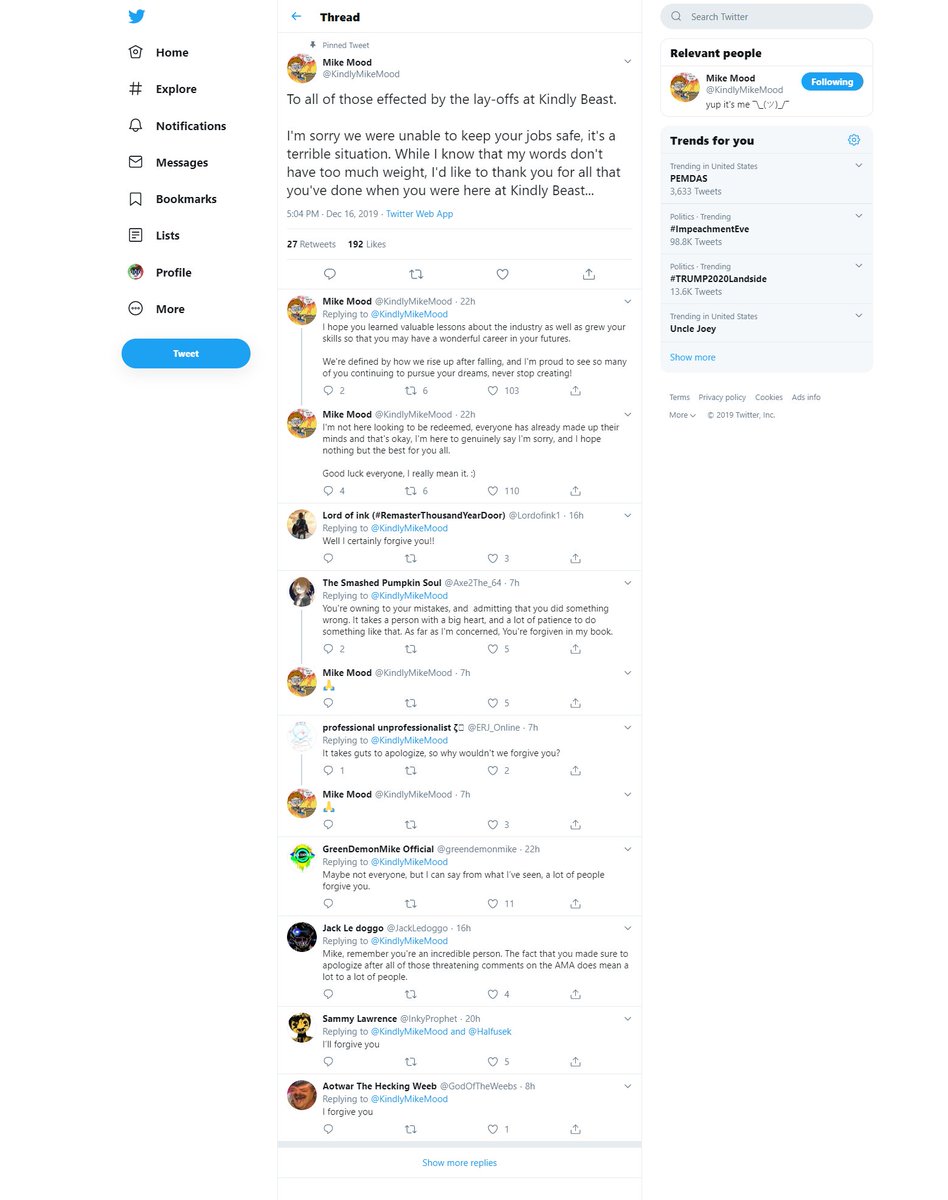 As a result of the debacle, Kindly Beast's website, along with its social media platforms, were shut down on June 1, 2020, confirming the team's discontinuation with no official announcement made. However, the host website is still currently available.